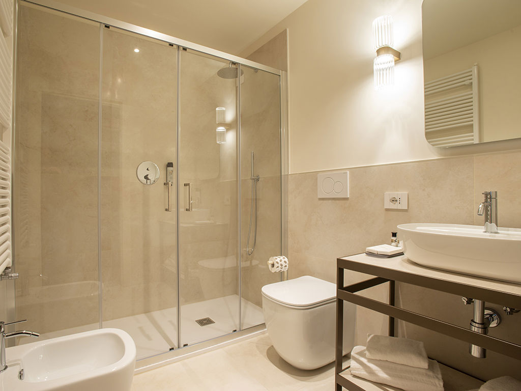 The bathrooms are refined and generously sized, featuring large walk-in showers and high-quality finishes.